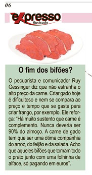E o povo que gosta de carne? De há muito sustento que carne é complemento. Nunca deveria ser 90% do almoço. A carne de gado tem que ser uma ótima companhia do arroz, do feijão e da salada. Acho que aqueles bifões que tomam todo o prato junto com uma folhinha de alface, só pagando em euros.