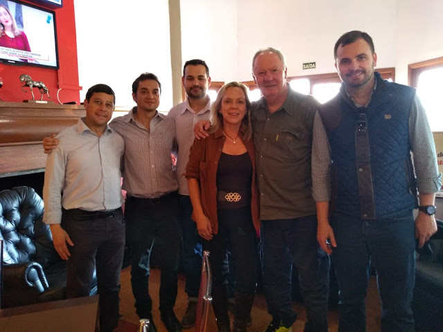 Marcos Peixoto (centro) atento no encontro de prefeitos. Juntos estavam o governo do estado, diretores e secretários. Abaixo, o prefeito Tiago Gorski e os vereadores Joel, Peru e Dionathan em visita à Casa Pampa (TV Pampa) onde foram recebidos pelo casal Ruy e Maristela Gessinger.