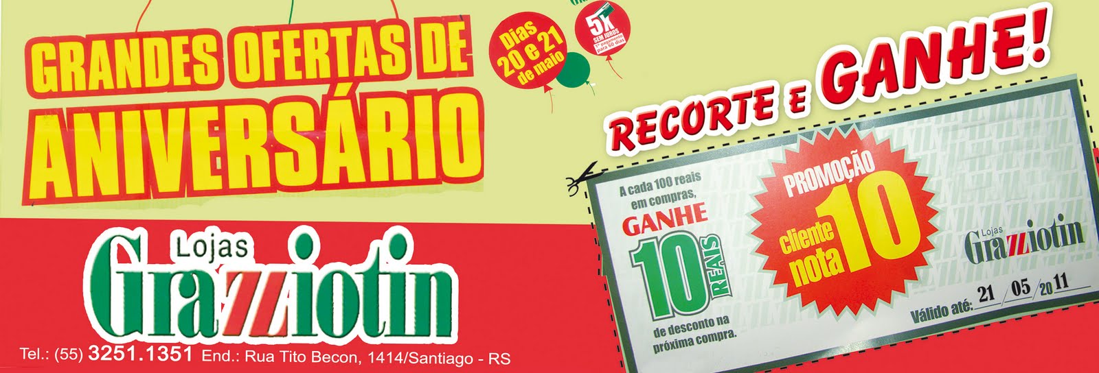 As lojas Grazziotin estão comemorando aniversário em Santiago e brindando seus clientes com promoções bastante atrativas. Por exemplo: camisetas de R$ 46,99 por R$ 12,99R$ 9,99. Lençol de casal de R$ 49,99 por 9,99. Básica feminina de R$ 21,90 por R$ 17,99, entre muitos outros preços imbatíveis.