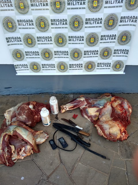 Cacequi – Policiais militares foram informados sobre ocorrência sobre um furto abigeato perto da linha férrea. Durante averiguações, foram localizados dois indivíduos: R.S.R, de 33 anos; e M.C.L, 38 anos. Eles estavam de posse de 70 kg de carne bovina e diversos objetos, como facas etc. Ao serem indagados, indicaram o local onde estava a carcaça do animal, reconhecido pelo dono. Diante dos fatos, todos presos e encaminhados à Delegacia para providências.