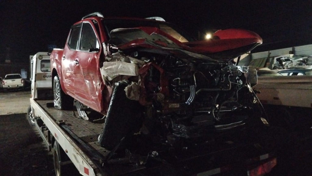 As caminhonetes bateram frontalmente, e posteriormente uma delas colidiu com a lateral da carreta.
