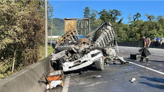 Com o impacto, o caminhão-baú e a van pegaram fogo. O motorista do caminhão morreu no local. O condutor da carreta sofreu ferimentos leves.