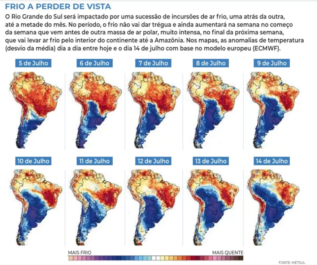 A MetSul prevê que a onda de frio que começou no final de junho no RS continuará por pelo menos mais duas semanas, com temperaturas geladas.