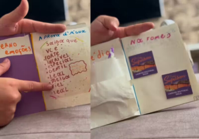 “Abrindo aqui oh, tá escrito caderninho das emoções. Aqui é pra quando eu estiver triste. Saiba que você é: forte, incrível, especial, gentil, leal, meiga, fiel e leal de novo”, disse a garotinha explicando a primeira página.