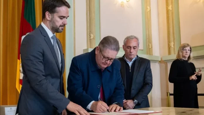 O governador Eduardo Leite destacou a importância do BRDE para investimentos em infraestrutura e sua preocupação com o desenvolvimento sustentável e a crise climática.