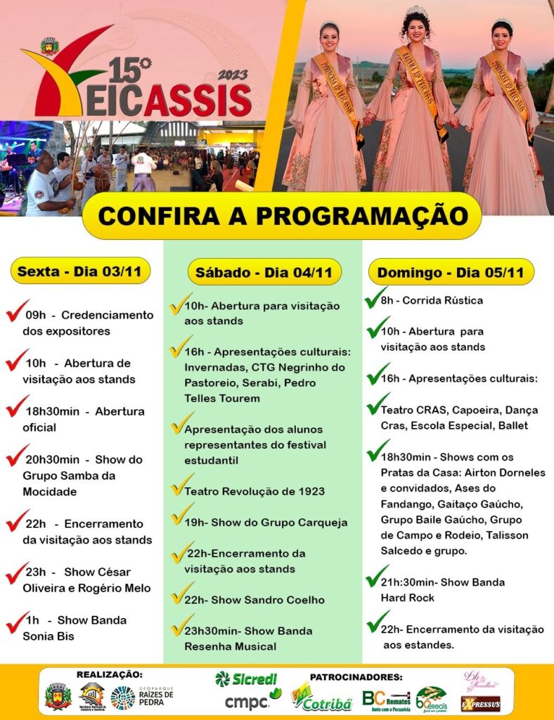 A abertura da 15ª Feicassis será nesta sexta (3), às 18h30min. À noite, haverá shows com Samba da Mocidade; César Oliveira e Rogério Melo e Banda Sônia Bis. No sábado, Grupo Carqueja; Sandro Coelho e Resenha Musical. O encerramento será no domingo com apresentações culturais; teatro Cras, capoeira, danças, ballet e shows com Airton Dorneles e Convidados; Ases do Fandango; Gaitaço Gaúcho; Grupo Baile Gaúcho; De Campo e Rodeio; Talisson Salcedo e Grupo e Banda Hard Rock.