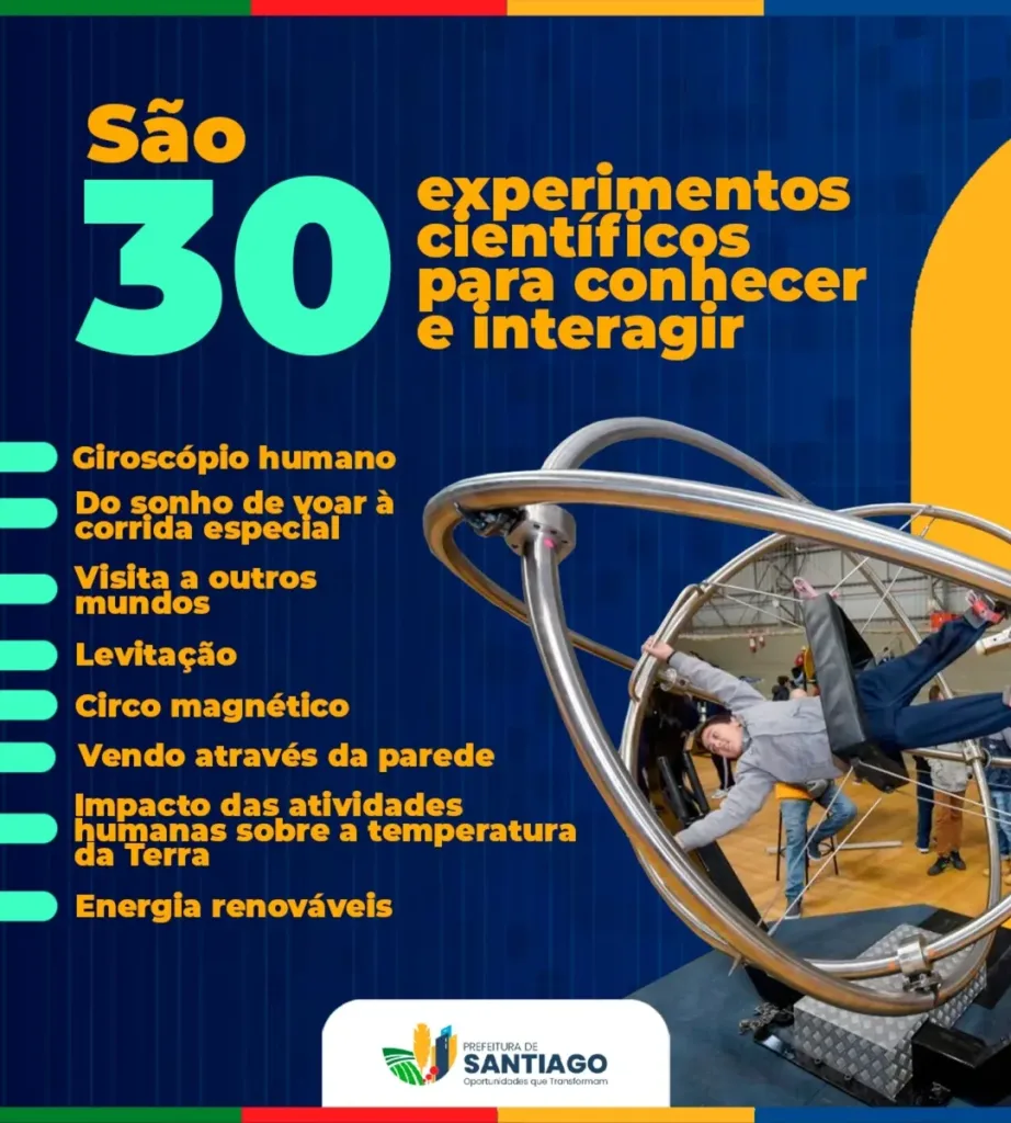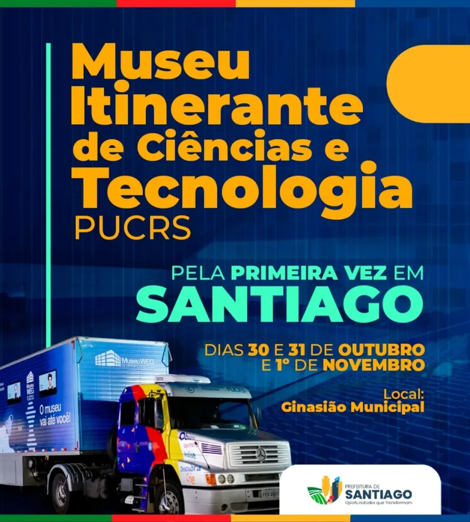 Santiago, RS – Santiago recebe, de 30 de outubro a 1.º de novembro, o Museu de Ciências e Tecnologia da PUC/RS no Ginasião Municipal. O público terá acesso a 30 experimentos interativos que estimulam o pensamento científico.