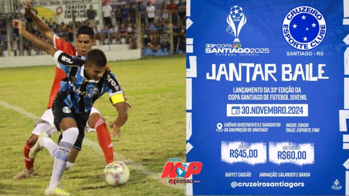 O Cruzeiro convida desportistas e a comunidade em geral para o jantar baile de lançamento da 33ª Copa Santiago. O evento será no dia 30, no Grêmio. Os cartões custam 45 reais para sócios e 60 para não associados. Estão disponíveis na secretaria do clube. O Buffet é da Cascão. A animação será de Calander e banda.