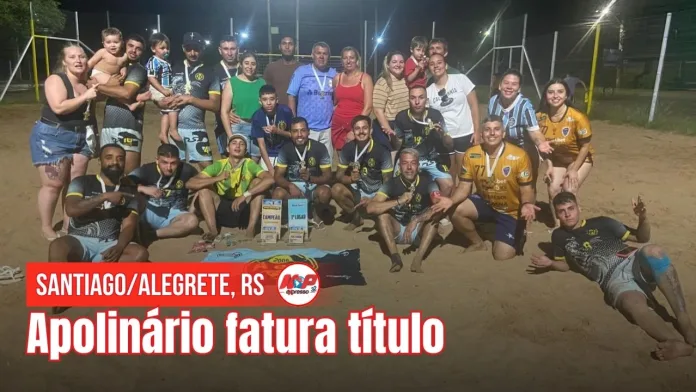 Santiago/Alegrete, RS – A equipe do Apolinário Esporte Clube (Santiago) sagrou-se campeã da 5ª etapa do Campeonato Gaúcho de Beach Soccer – Etapa Fronteira Oeste, dispuatda neste domingo (25) em Alegrete. Além do troféu, o time santiaguense teve o artilheiro da competição, Mateus Soares, e os goleiros menos vazados, Dionatan Castro e Evandro Claudir.