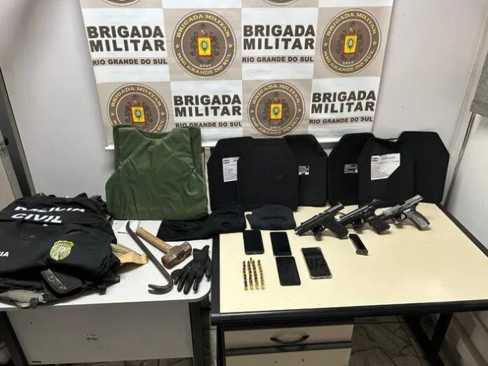 A polícia localizou o veículo utilizado pelos suspeitos, que possuía placas clonadas. No local, foram apreendidos três armas de fogo, oito coletes balísticos e 33 munições. A Brigada Militar confirmou que os envolvidos tinham antecedentes criminais e integravam uma organização criminosa.