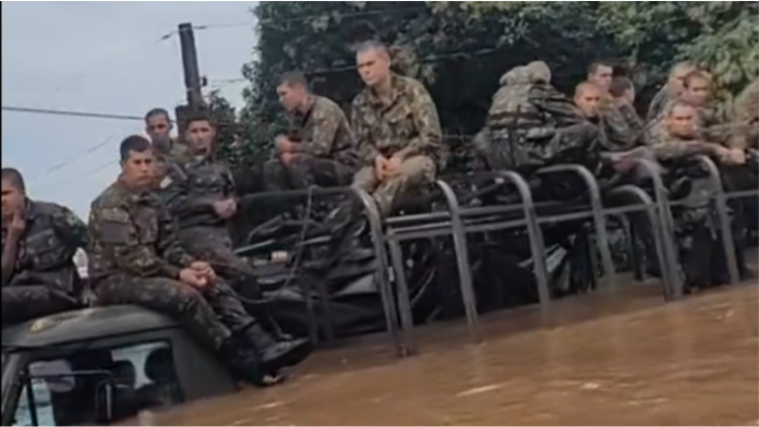 Nas imagens, os militares estão abrigados em cima da carroceria dos veículos enquanto outras embarcações navegavam pela área alagada.