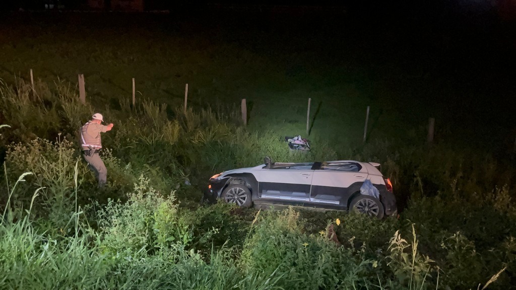 Na RSC-287, o criminoso desrespeitou ordens de parada e fugiu em alta velocidade, capotando o carro próximo ao Trevo de Santuário. Policiais militares prenderam o suspeito e apreenderam uma pistola calibre 380 e objetos roubados. A equipe policial autuou o criminoso em flagrante, enquanto a vítima registrou ocorrência.