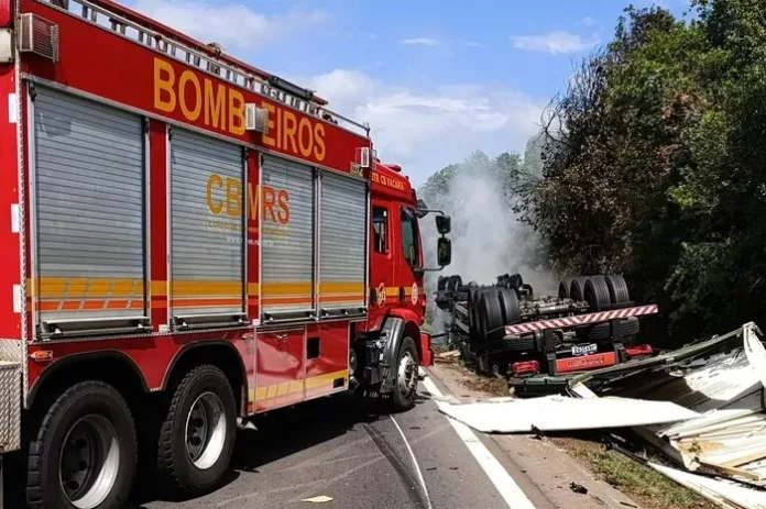Campestre da Serra (Região de Caxias do Sul) – Um caminhão carregado de chapas de MDF tombou e pegou fogo na RS-122. O acidente ocorreu na manhã de sábado (15).