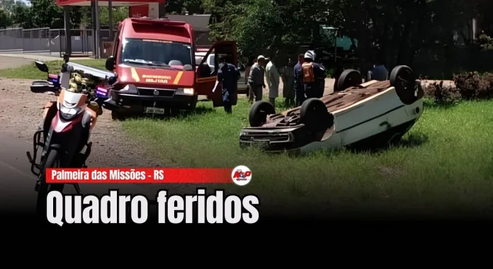 Palmeira das Missões – RS – Quatro pessoas ficaram feridas depois que um Gol capotou por volta de 12h30 de domingo na Avenida Independência, em frente à entrada da UFSM. O carro levava cinco ocupantes e parou de ponta-cabeça fora da pista. O motorista não se feriu.