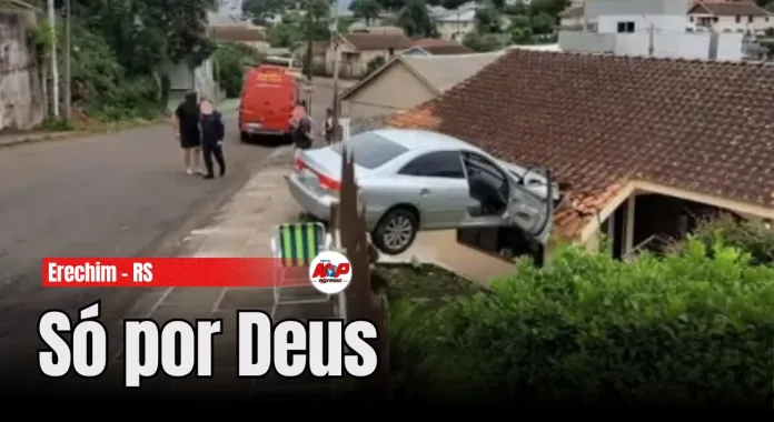 Erechim – RS – (Região de Passo Fundo) – O carro estacionado no alto de uma rua inclinada ganhou velocidade, desceu desgovernado e entrou em uma casa na manhã deste sábado. A criança que estava no banco de trás foi retirada por moradores antes da chegada do socorro.