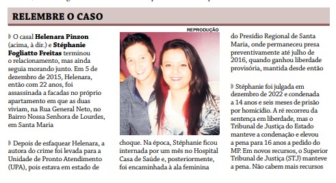 Condenação e Prisão: Stéphanie Fogliatto Freitas foi presa em Santa Maria. Ela foi condenada em 2015 a 16 anos de prisão pela morte da ex-companheira Helenara Pinzon, ocorrida em 2015. Após o Ministério Público recorrer, a pena inicial de 14 anos e seis meses foi aumentada.