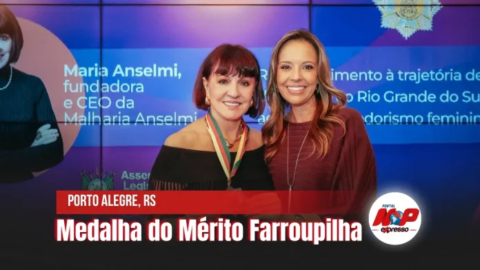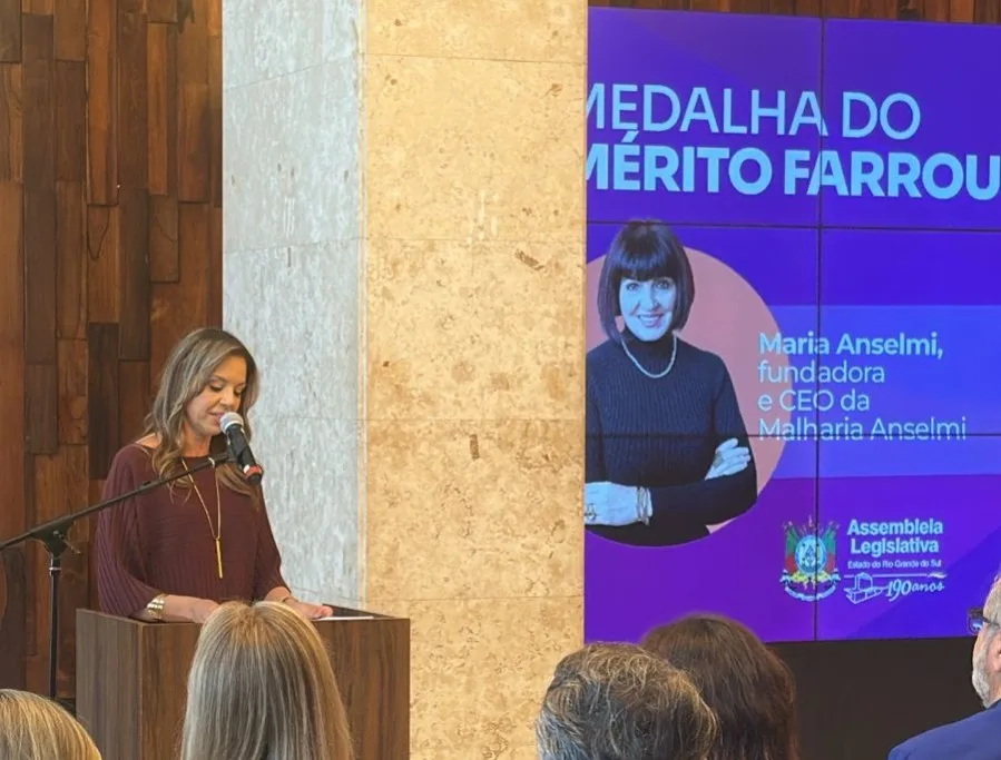 Porto Alegre, RS – Em uma solenidade marcada por emoção e reconhecimento, a empresária Maria Anselmi, fundadora e CEO da Malharia Anselmi, recebeu nesta quarta-feira, 19 de novembro, a Medalha do Mérito Farroupilha, maior honraria concedida pela Assembleia Legislativa do Rio Grande do Sul. A cerimônia aconteceu no Salão Júlio de Castilhos, em Porto Alegre, por proposição da deputada estadual Delegada Nadine.