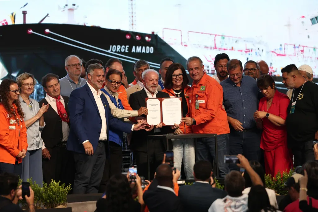 O presidente Lula assinou contratos de 2,8 bilhões para a construção de cinco navios gaseiros, além de 18 barcaças e 18 empurradores. As embarcações serão construídas no RS, em Santa Catarina e no Amazonas, com operação da Transpetro, subsidiária da Petrobras. Fonte: Correio Braziliense