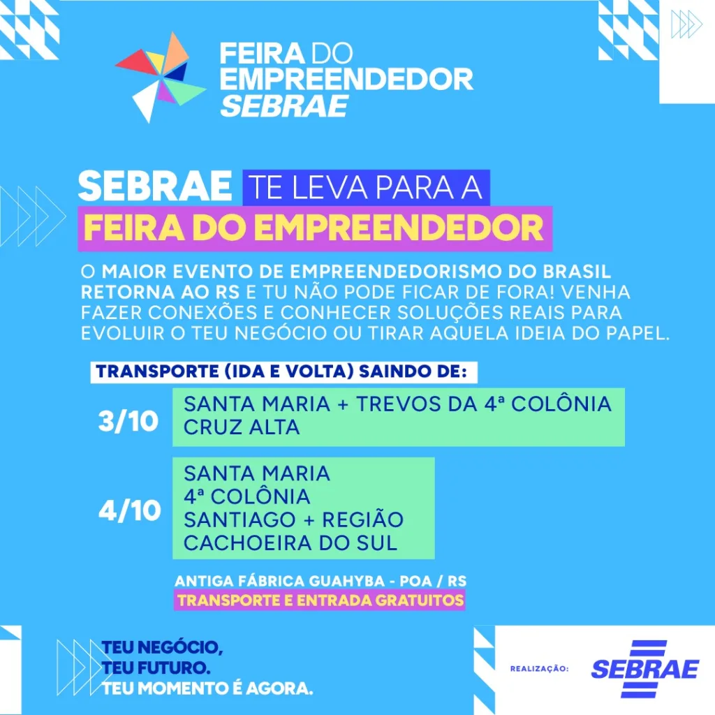 O Sebrae disponibiliza ônibus gratuito para empreendedores de Santiago e do Vale do Jaguari no dia 4 de outubro. A saída está marcada para as 4h em frente ao CES, com paradas em Nova Esperança do Sul, Jaguari, São Vicente do Sul e São Pedro do Sul. O retorno ocorre às 19h.