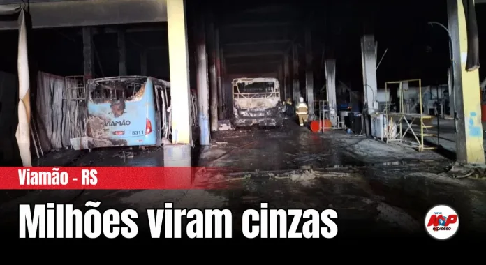 Viamão – RS – Um grande incêndio atingiu a empresa de ônibus Viamão, no centro da cidade, na noite desta terça-feira (7). Segundo os bombeiros, as chamas começaram por volta das 21h e destruíram parte do setor administrativo, quatro ônibus, uma viatura da Brigada e um carro.