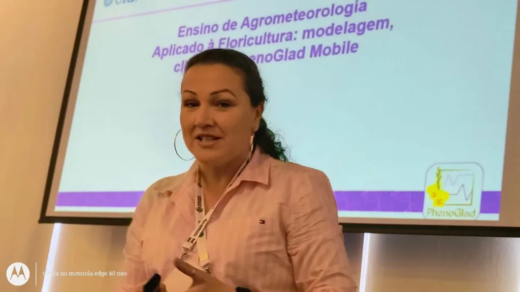 A professora da URI e secretária municipal de Jaguari, Mora Eliza Siqueira Fernandes, coordenadora da equipe PhenoGlad local, apresentou o tema “A contribuição da Equipe PhenoGlad e do Projeto Flores para Todos no ensino de graduação e pós-graduação nos últimos 15 anos.” Ela destacou o impacto da iniciativa na formação acadêmica e técnica de estudantes, profissionais e produtores, reforçando o papel das universidades na valorização da cadeia de flores no Brasil.