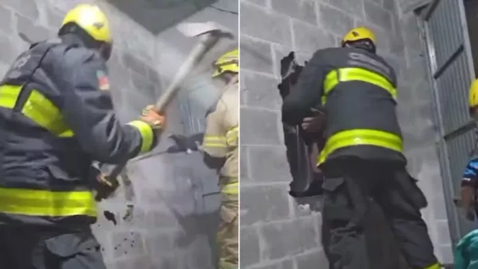 Os bombeiros precisaram usar um martelete e uma marreta para abrir uma passagem na parede lateral e acessar o elevador. A síndica tentou reiniciar o equipamento antes da chegada do resgate, mas os comandos não responderam.