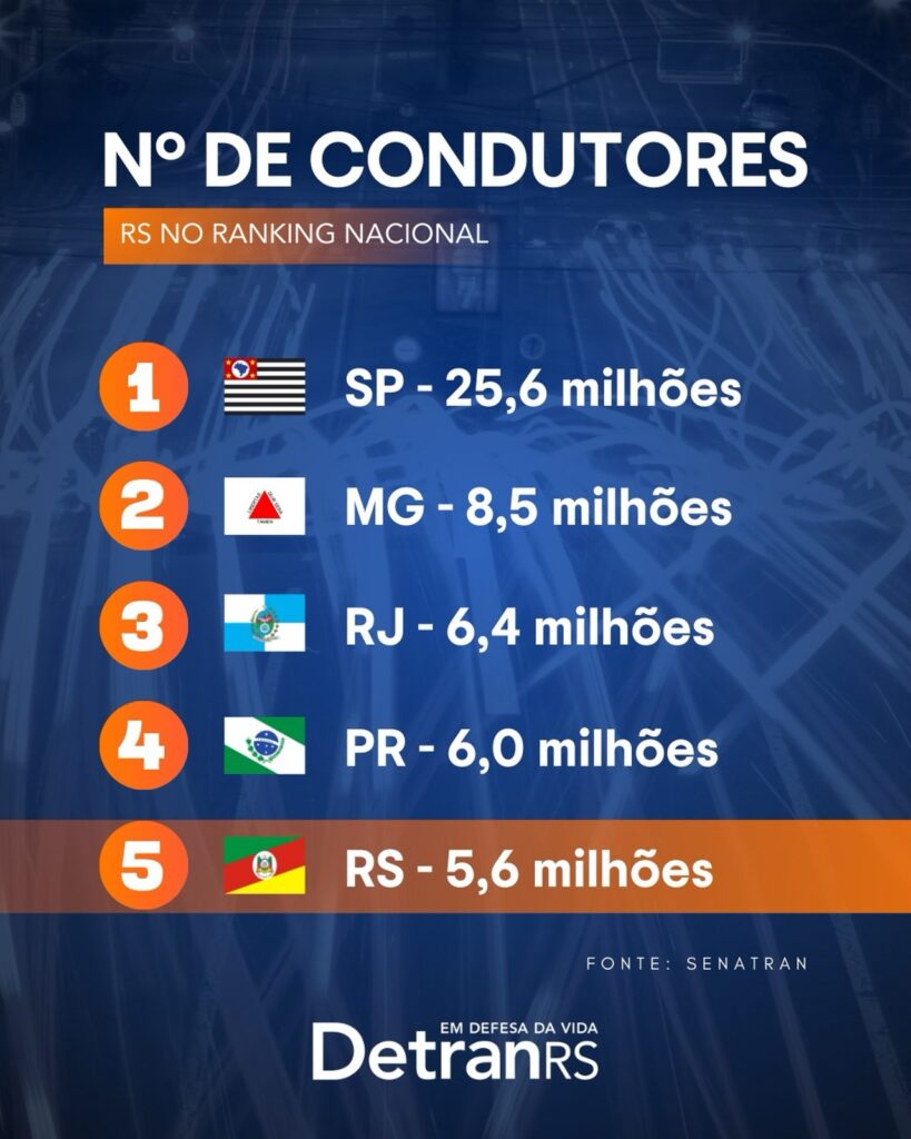 O estado de São Paulo lidera com 25,6 milhões de motoristas, seguido por Minas Gerais com 8,5 milhões. O Rio de Janeiro e o Paraná possuem 6,4 e 6,0 milhões de condutores, respectivamente, antes do RS fechar o top 5.