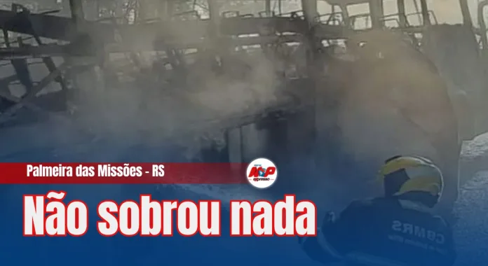 Palmeira das Missões – RS – (Região de Frederico Westphalen) Um ônibus de turismo pegou fogo na tarde deste sábado, na ERS-569, no trecho que liga o município a Novo Barreiro. O motorista estava sozinho e conseguiu parar no acostamento e sair antes que as chamas se espalhassem.