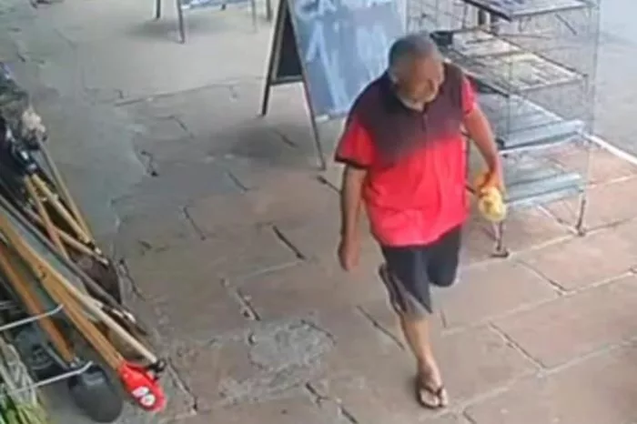 Uma câmera de segurança gravou o idoso saindo de uma fruteira com uma garrafa de água mineral às 10h10. Ele vestia uma camiseta vermelha com detalhes em preto, bermuda cinza e chinelos pretos. Após sair do local, cumprimentou outro homem e seguiu em direção oposta.