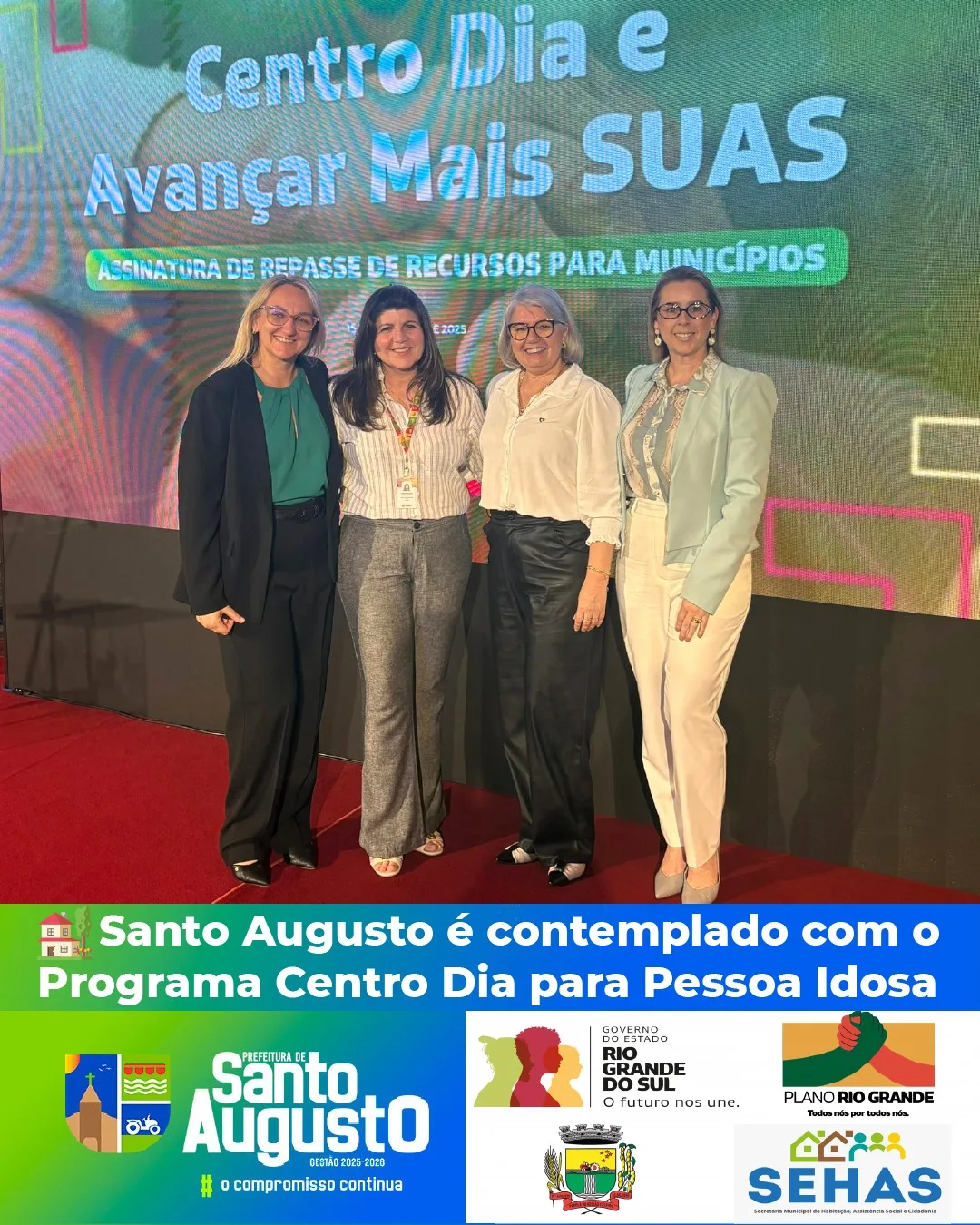 Santo Augusto, RS – Na última quarta-feira (15), a prefeita Lilian Fontoura Depiere, a secretária Márcia Fucilini e a assistente social Elenice Alebrandt, da Secretaria de Habitação, Assistência Social e Cidadania, participaram de ato oficial com o governador Eduardo Leite e o secretário de Desenvolvimento Social, Beto Fantinel, no Palácio Piratini, em Porto Alegre. Foram confirmados repasses que totalizam R$ 69 milhões para os programas Avançar Mais SUAS e Centro Dia para Pessoa Idosa, beneficiando 148 municípios do RS.