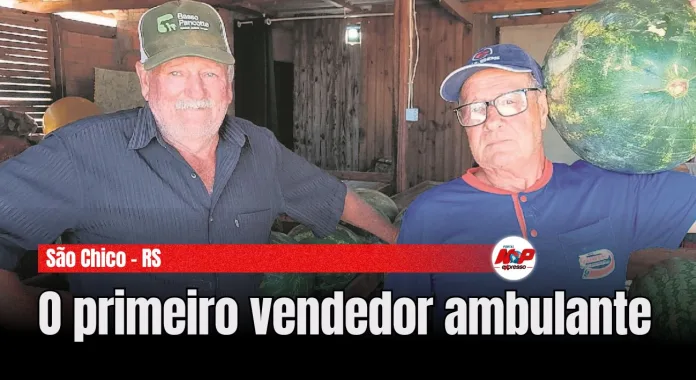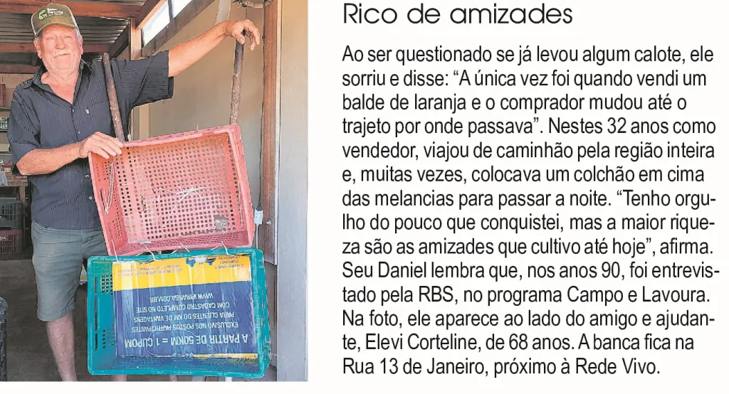 São Chico – RS – Daniel Mohr, de 72 anos, é considerado o pioneiro da venda de melancias no município. Há mais de três décadas na atividade, ele foi o primeiro vendedor ambulante da cidade, vendendo frutas em um carrinho de mão pelas ruas. Hoje, mantém a banca na 13 de Janeiro e diz que a maior riqueza deixada pela profissão foram as amizades construídas ao longo dos anos.