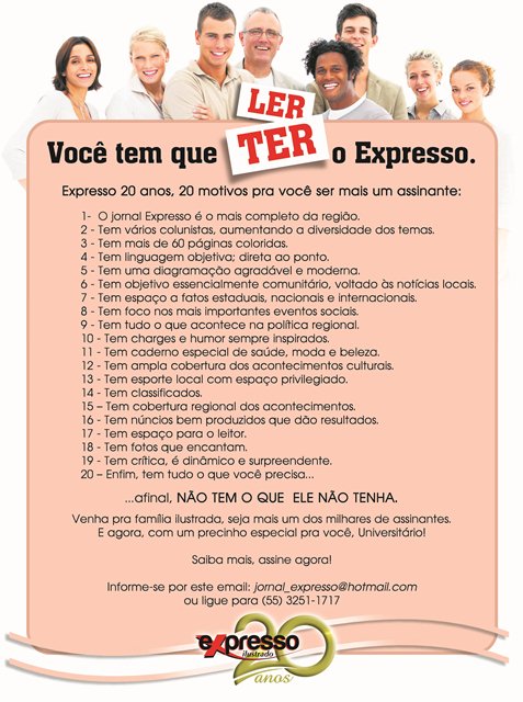 Geral InícioGeral 20 motivos pra você ler e ter o Expresso Publicado em 08/05/2013 POR NP Expresso FacebookTwitterWhatsAppLinkedinTelegram DEIXE UMA RESPOSTA Cancelar resposta Comentário: Por favor digite seu comentário! Nome:* Por favor, digite seu nome aqui E-mail:* Você digitou um endereço de e-mail incorreto! Por favor, digite seu endereço de e-mail aqui Site: Salve meu nome, e-mail e site neste navegador para a próxima vez que eu comentar. Siga o NP Expresso 184.758 132,297FãsCurtir 72,136SeguidoresSeguir Notícias Recentes Esportes Sete acusados viram réus por tortura e mort3 em clínica Estação - RS - (Região de Erechim) A mort3 do interno Marcos Bohn Nedel,... 07/03/2026 Geral Empregos: Santiago fecha janeiro com saldo negativo Santiago registrou um saldo negativo de 60 vagas de emprego formal em janeiro. O... 07/03/2026 Nacional Criança morre após cair de trator e ser atingida por roçadeira Itaitinga, Ceará - Uma criança de 11 anos morreu na manhã de quinta-feira (5)... 07/03/2026 Nacional Mutirão cumprirá mil mandados de prisão contra agressores de mulheres Brasília, DF - O Comitê do Pacto Brasil entre os Três Poderes anunciou nesta... 07/03/2026 Leia Também Esportes Sete acusados viram réus por tortura e mort3 em clínica Estação - RS - (Região de Erechim) A mort3 do interno Marcos Bohn Nedel,... 07/03/2026 Geral Empregos: Santiago fecha janeiro com saldo negativo Santiago registrou um saldo negativo de 60 vagas de emprego formal em janeiro. O... 07/03/2026 Nacional Criança morre após cair de trator e ser atingida por roçadeira Itaitinga, Ceará - Uma criança de 11 anos morreu na manhã de quinta-feira (5)... 07/03/2026 VER TODAS AS NOTÍCIAS