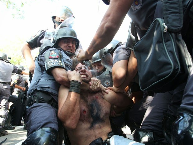 A Tropa de Choque da Polícia Militar entrou em confronto com manifestantes na manhã desta quinta em São Paulo, durante um protesto contra a Copa. Um homem foi detido. A jornalista Bárbara Arvanitidis, da rede americana CNN, ficou ferida por estilhaços. Pouco depois da confusão inicial, a polícia voltou a jogar bombas para desbloquear a rua. Houve correria e uma das bombas atingiu o pátio de um prédio residencial.