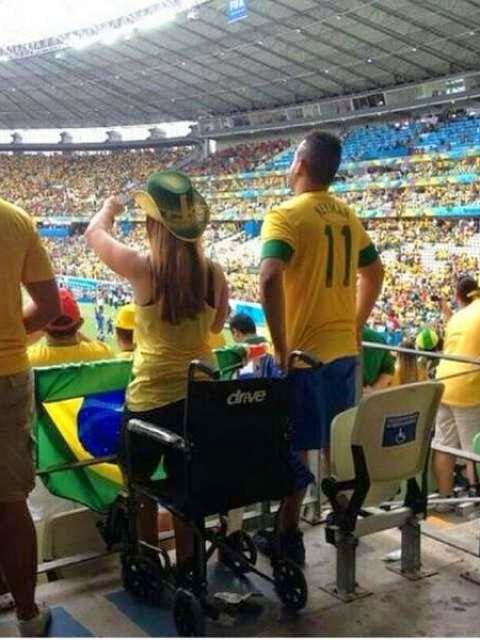 Esta e outras imagens estão correndo o mundo pelas redes sociais. Pessoas que supostamente usariam cadeiras de rodas estão em pé nos estádios, assistindo tranquilamente aos jogos. Acontece que para estes setores geralmente sobraram ingressos, o que tornou-se atrativo para os espertalhões. No Facebook não é difícil encontrar alguém vendendo o ingresso, a cadeira e até o laudo médico, “atestando” que a pessoa é deficiente física. A Fifa já alertou que se pegar alguém usando esta artimanha, retira do estádio na hora.