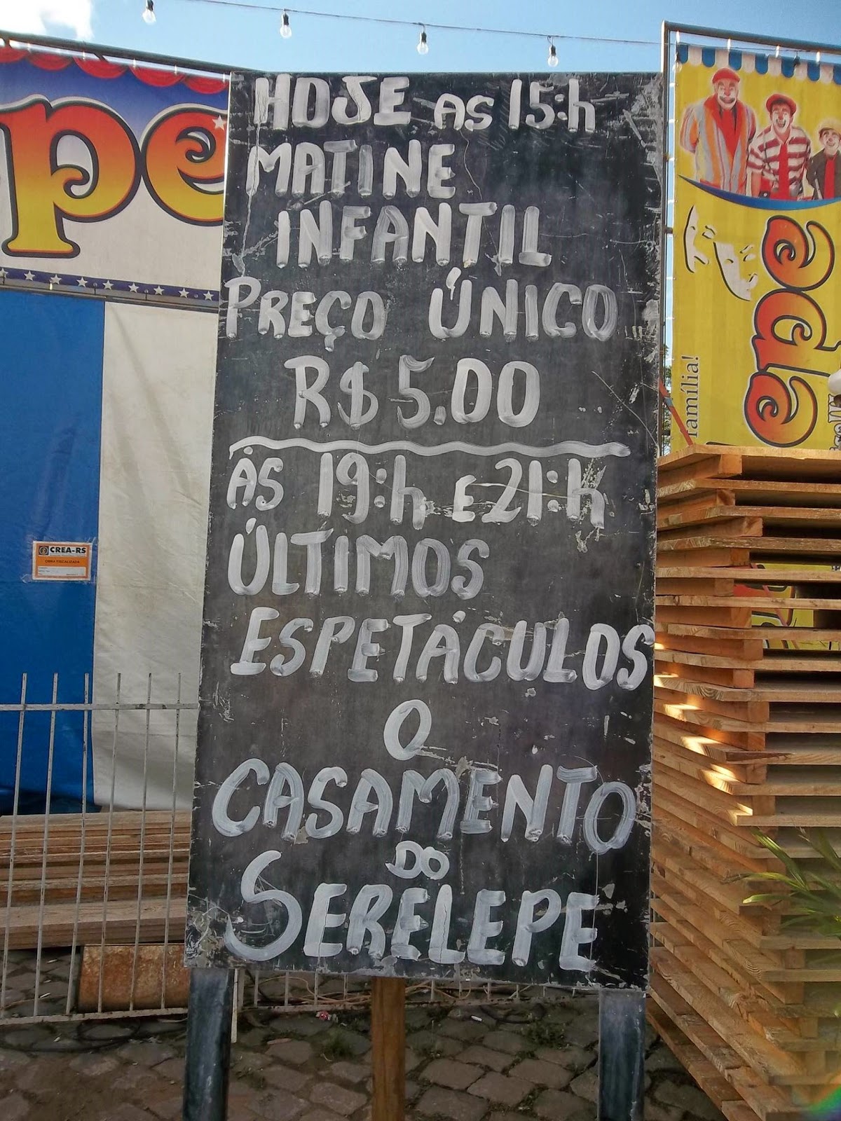 É hoje, a grande despedida do teatro Serelepe que deixa Santiago rumo à fronteira. Reserve seu ingresso a 10 e 15 reais para ver O Casamento do Serelepe; às 19 e às 21 horas. Muita gargalhada e uma despedida emocionante com várias surpresas. Corra e pegue seu ingresso no teatro armado na Estação.