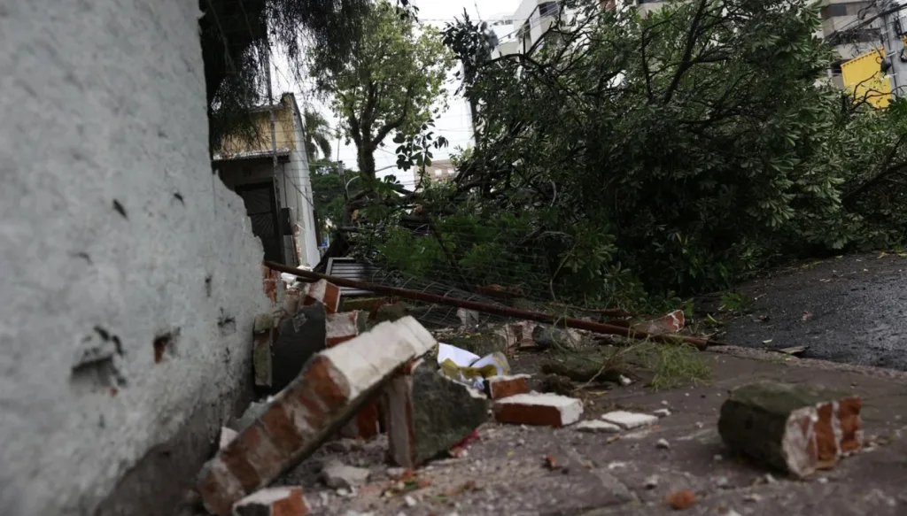 A réplica da Estátua da Liberdade caiu no estacionamento da loja. Um carro estava embaixo, mas a estrutura não pegou nele. Ninguém se machucou ali. Em Porto Alegre, árvores caíram e muita gente ficou sem luz e água.
