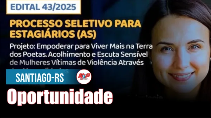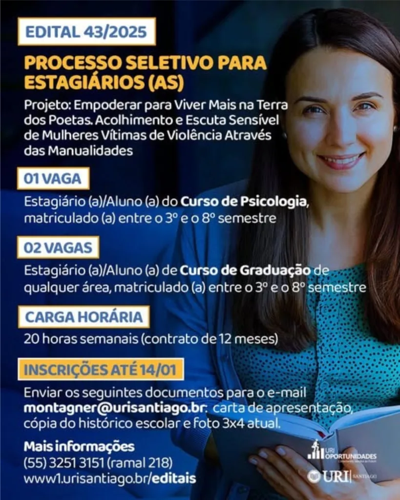 Santiago, RS – A URI Santiago está com inscrições abertas para o Processo Seletivo de Estagiários(as), conforme o Edital nº 43/2025. As vagas são para atuação no projeto “Empoderar para Viver Mais na Terra dos Poetas”, que tem como foco o acolhimento e a escuta sensível de mulheres vítimas de violência, por meio de atividades de manualidades.