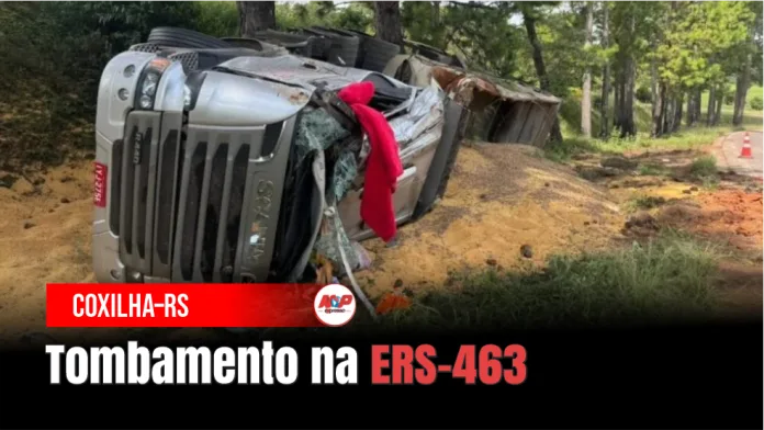 Coxilha – RS – (Região de Passo Fundo) – Uma carreta com soja tombou na manhã de segunda (16) na ERS-463, rodovia que liga os municípios de Coxilha e Tapejara. O motorista ficou ferido no acidente.