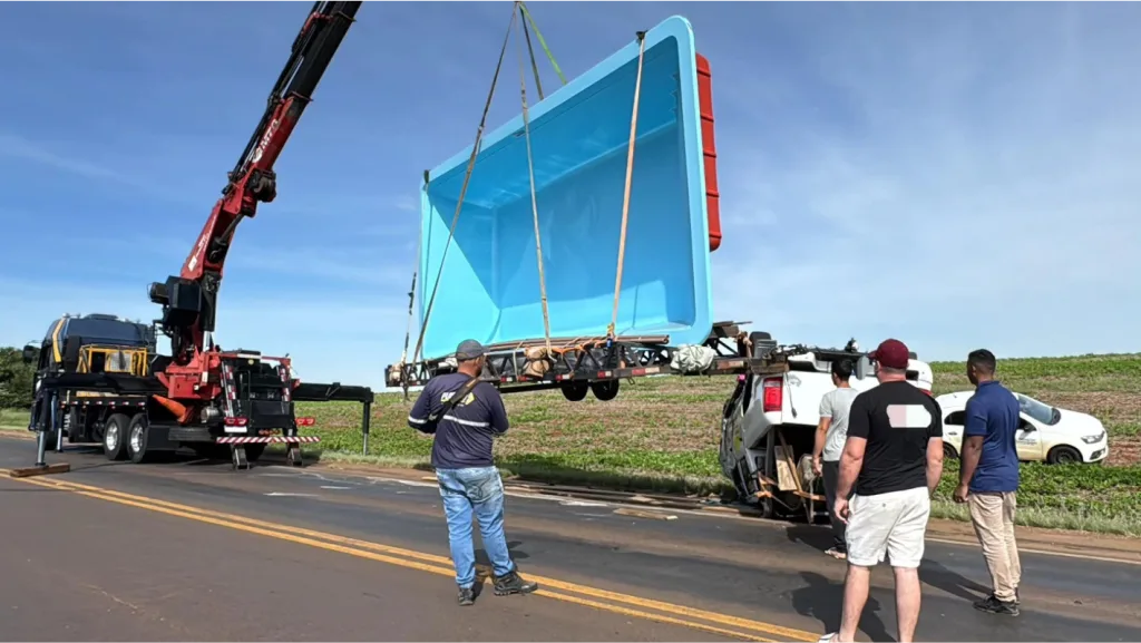De acordo com relatos, a força do vento teria deslocado a piscina sobre o reboque. Esse movimento gerou instabilidade na estrutura, fazendo com que o reboque tombasse e puxasse a caminhonete junto. O sujeito que dirigia o veículo tem 39 anos e não se feriu com gravidade.