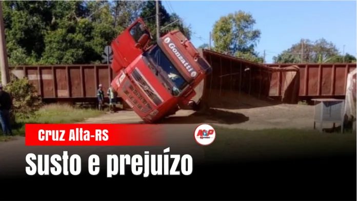 Cruz Alta – RS – (Região de Ijuí) – Uma carreta foi atingida por um trem enquanto cruzava a linha férrea no interior do município, na localidade de Benjamin Nott. Mesmo com a força da batida, o motorista não ficou ferido.