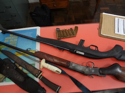 São Chico – Na última segunda-feira uma denuncia anônima levou os policiais a uma propriedade na RS 241, interior. Chegando ao trevo da RS 377, eles abordaram um Kadett conduzido por J V B no qual encontraram três cachorros no porta-malas.  Outros policiais foram ao rio Jaguarizinho onde foi encontrado um Gol na entrada de uma fazenda. O motorista era LGP (20 anos). No porta-malas estavam uma espingarda 22 com registro em seu nome, outra espingarda cal 36 sem marca e sem registro, cartuchos, facas e 22 kg de carne de capivara. Todos foram presos e encaminhados à Delegacia para providências.
