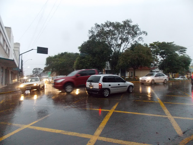 Quer um dia um pouco pior para o trânsito em Santiago? Então toma por base um dia de chuva. Mais carros, menos visão, mais pressa e menos paciência. A soma é mais problemas. Essa rua é a Sete com a Osvaldo Aranha. O povo que dirige sabe, mas sempre tem alguns que fazem questão de parecer que não sabem e param em cima dessa área chamada “zona de conflito”. Ali não é lugar de parar, só de passar.