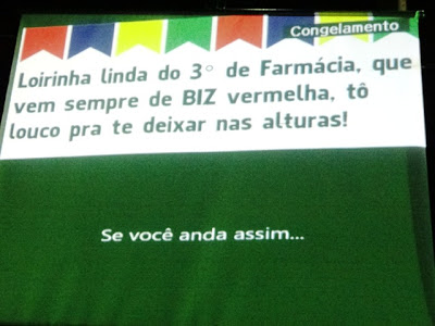 No telão, o recadinho pra loirinha da Biz Vermelha.