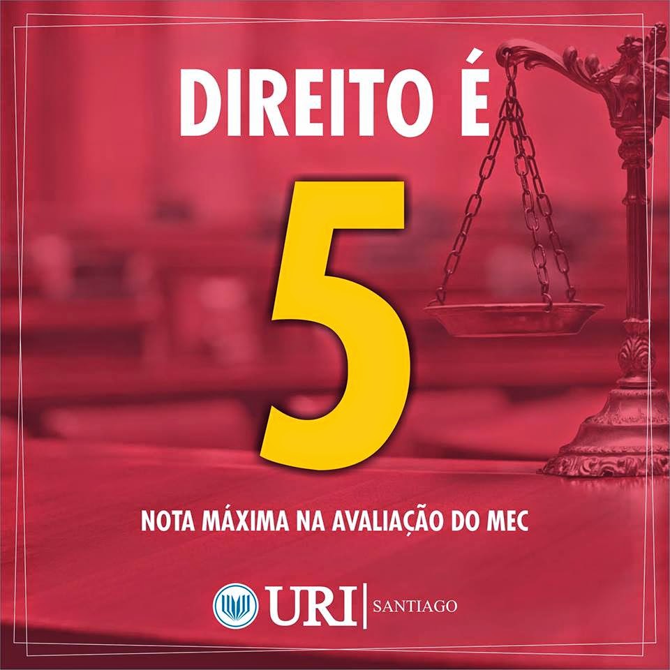 A direção da URI Santiago, coordenação do Curso de Direito, professores, acadêmicos e funcionários celebram com satisfação a informação divulgada pelo MEC na manhã desta segunda-feira (06): o Curso de Direito conquistou a nota máxima na avaliação do Ministério da Educação e Cultura. Parabéns a todos!