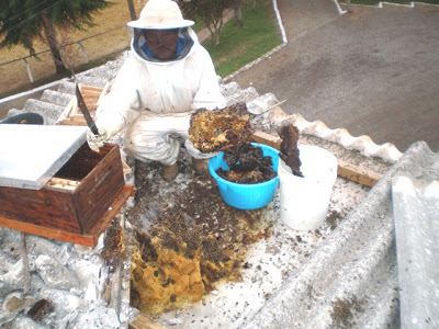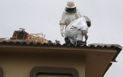 Seria um dia normal na Brigada de Santiago, seria, não fossem as abelhudas intrometidas. Ao tentar colocar uma antena de rádio na cobertura de um dos pavilhões, o sargento Papalia deu de cara com um enxame de abelhas (entre a pré-laje e o telhado). Algumas não deram moleza ao bravo soldado e o picaram. Foi preciso chamar um especialista que acabou levando as danadas para sua propriedade rural, onde outras lhe aguardavam. Lógico, tudo com equipamento especial para ninguém se machucar, a exemplo do fotógrafo (um dos policiais) que registrou as imagens.