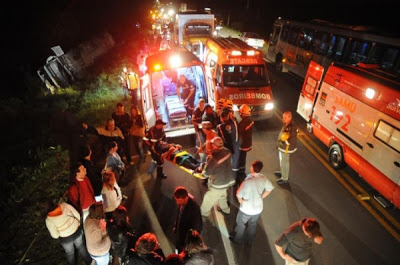 Um acidente envolvendo um ônibus da Viação Santa Cruz e um caminhão deixou 41 pessoas feridas pouco depois das 19 horas de ontem, próximo ao pedágio de Venâncio Aires. O ônibus seguia pela RSC-287 no sentido Santa Cruz-Venâncio Aires quando colidiu na traseira de um caminhão de Venâncio a cerca de 300 metros do pedágio. Com a força da batida o caminhão atingiu um Megane que seguia na frente. O ônibus tombou para o lado direito da pista mas os 22 feridos com mais gravidade estão bem e devem ser liberados no final de semana.