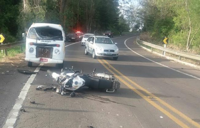 controle ao sair da curva, invadiu a pista contrária e bateu frontalmente com a Kombi. Ficaram machucados o motociclista (63 anos, de Osório) e uma jovem de 17