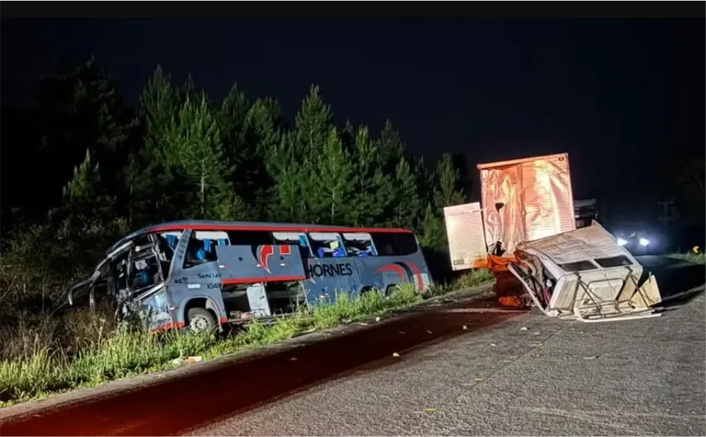 Paraná – Duas pessoas morreram e 23 ficaram feridas em um grave acidente envolvendo um ônibus fretado e um caminhão na noite de domingo (5), na PR-151, entre São Mateus do Sul (PR) e Três Barras (SC).