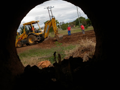 Há semanas, o recinto da estação férrea se transformou num depósito de dormentes, que estão sendo usados para fazer substituições na linha férrea. Agora, os funcionários da América Latino Logística estão fazendo mais um serviço, colocando tubulação e facilitando o escoamento de água no trecho final da rua Francisco Camargo, que dá acesso ao bairro São Vicente.