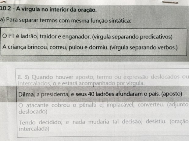 Em outro tópico, a apostila menciona o nome da presidente do Brasil para explicar o uso da vírgula. “Dilma, a presidenta, e seus 40 ladrões afundaram o país (aposto)”.